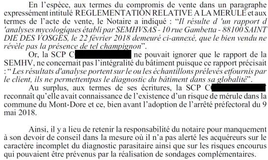 Les actes (compromis et acte réitératif) rédigés par le notaire énoncent que le rapport d’analyse établit l’absence de mérule dans le bien vendu.