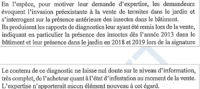 Explication : il avait récupéré l’ancien diagnostic, puis rappelé, dans son propre rapport (en complément de ses constatations : présence de termites dans le jardin), les conclusions du précédent diagnostic (qui signalait une infestation). Le passé venait donc appuyer le présent. Voici deux extraits de la décision rendue (désormais définitive) :